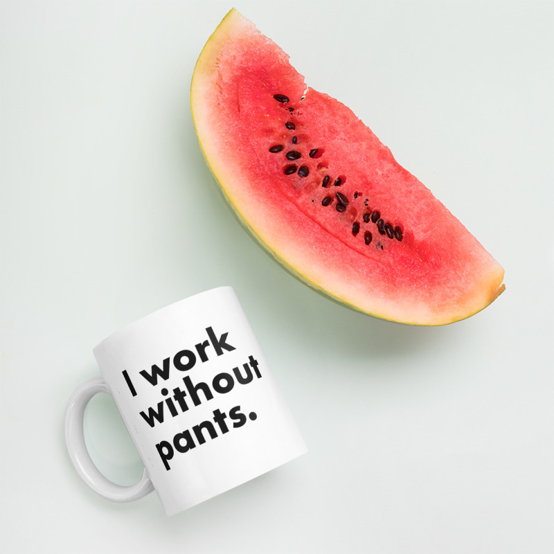 Support entrepreneurs in developing countries by purchasing an "I work without pants" coffee mug.
